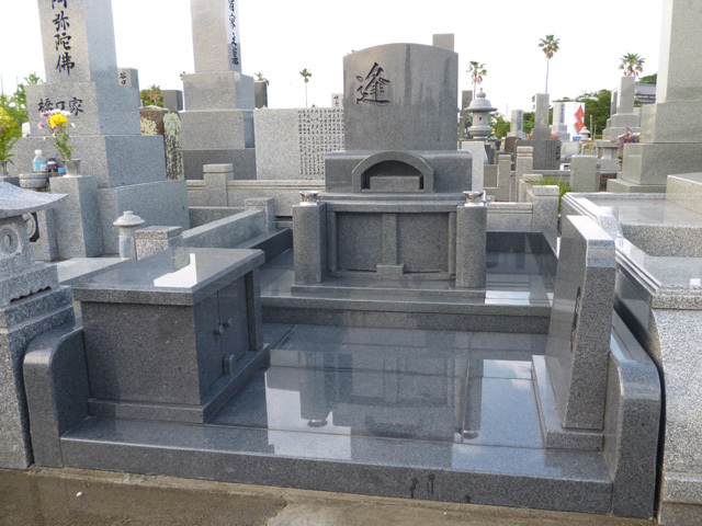 竿石をのせ終ったら、灯篭、霊標、物置台を据えつけ、玉砂利を敷き完成。